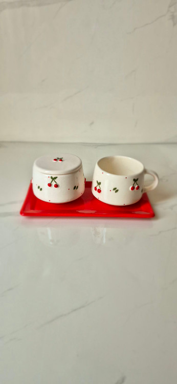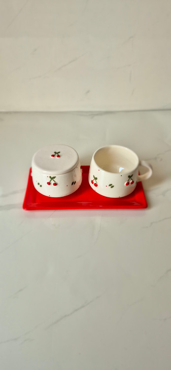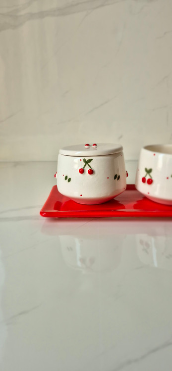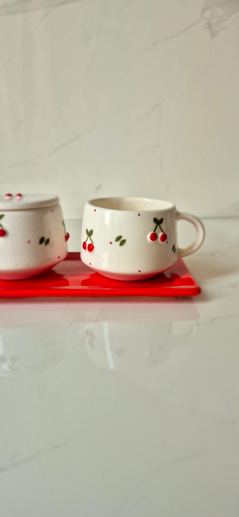 ست سرامیکی تکنفره طرح آلبالو برجسته، یک انتخاب شیک و دلنشین برای سرو چای، قهوه یا دمنوش است. این ست شامل یک فنجان خوشدست با طراحی برجسته آلبالوهای قرمز براق، یک زیره سرامیکی هماهنگ و یک قندون دردار زیباست.
