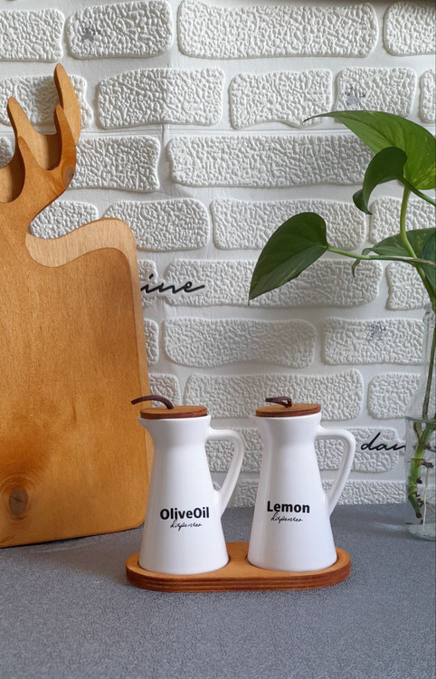 ست ظرف آبلیمو و روغن کوچک با زیره چوبی | سرویس شیک و کاربردی برای میز غذاخوری