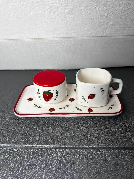 ست چایخوری تکنفره طرح توت فرنگی سرامیکی | فنجان، قندان و سینی با طراحی فانتزی و جذاب
