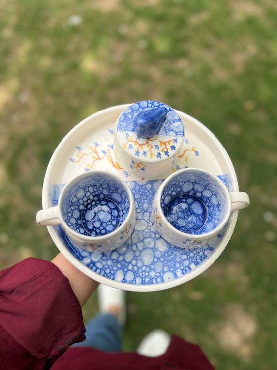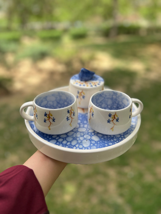 دو فنجان یک قندان در دار و سینی
